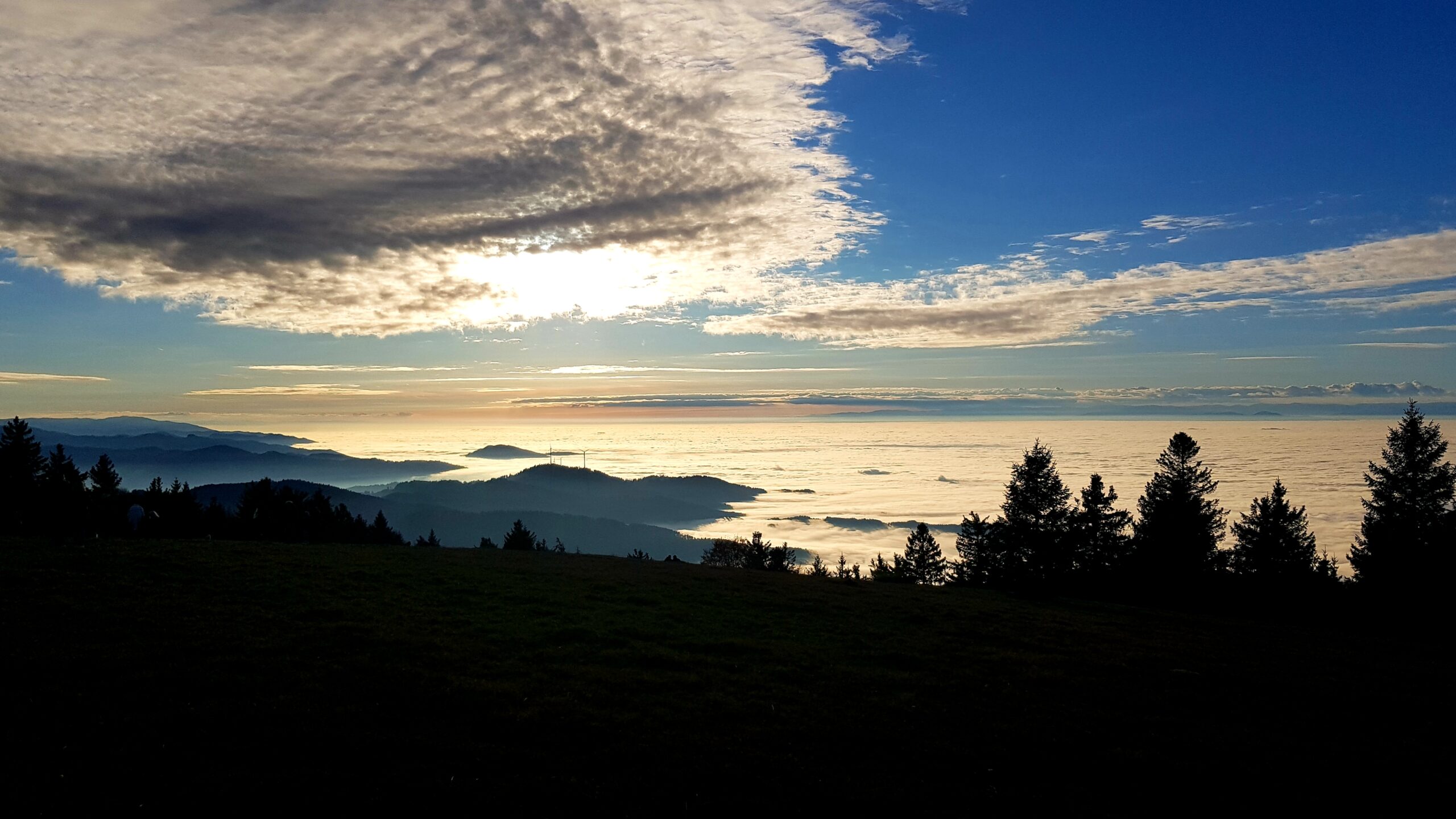Da die geografische und topografische Entfernung von hier bis zur Kandelspitze ungefähr gleich sind, ist der Anfahrtsweg in die Sonne keine Weltreise. Natürlich war ich dort oben nicht allein. Doch schon die 7°C mehr, der blaue Himmel und die wärmende Sonne waren eine Wohltat. Ich hatte Glück und fand eine einsame Bank mit Blick über das Wolkenmeer. Da bin ich bis zum Sonnenuntergang geblieben und habe alles an Licht mitgenommen, was ich kriegen konnte.